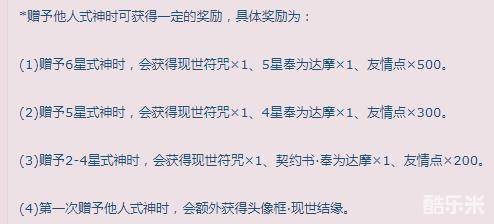 每个游戏角色只能接受一次式神赠予,赠送方赠送一次后,会产生30天的CD,一个月后才能对其他人进行赠送。