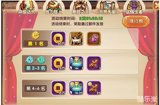 活动内容:活动截止时间,统计普通副本排行榜名次,相应排名的玩家获得奖励。