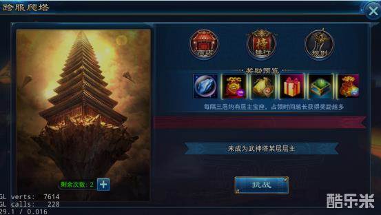 1.玩家可单人或与全平台其他玩家组成最多3人队伍进行爬塔;武神塔最高30层,每人每天有2次免费爬塔机会,可消耗元宝增加次数;