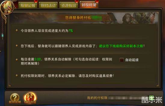好友托管系统就讲解到这了,欢迎大家一起来讨论!个人觉得这个系统还是蛮不错的,门槛不高,土豪没空可以帮忙托付给好友帮忙做任务(不用担心给号给别人导致被盗号),获得的副本活动奖励也是100%跟自己手动没差,好友也可以通过这个来赚点零花钱。