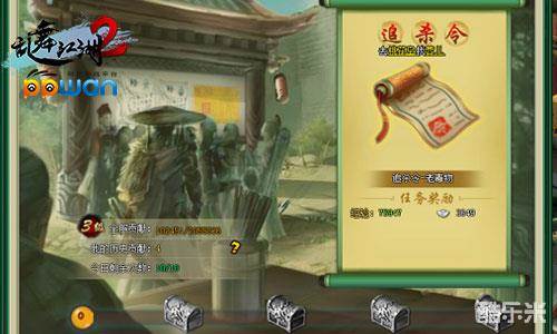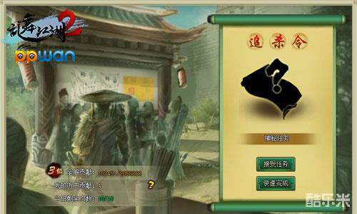 在ppwan《乱舞江湖2》的世界中,只要玩家等级达到10级之后,系统自会在玩家游戏界面上生成一道江湖追杀令。在这里玩家可以接受来自系统或玩家的江湖追杀任务,每完成一次江湖追杀令,玩家就会获得大量的经验奖励,并且随着玩家接受的江湖追杀令的不同,玩家也会获得不同数量的经验!