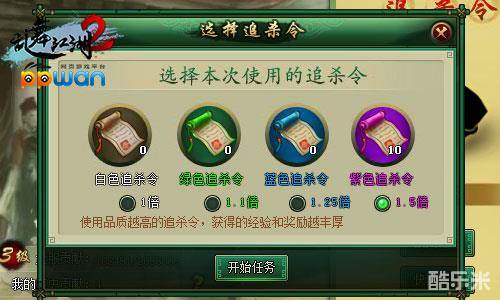 在ppwan《乱舞江湖2》中,江湖追杀令一共分为四个档次:白、绿、蓝、紫。其中,白色追杀令可以获得1倍经验、绿色追杀令可获得1.1倍经验、蓝色追杀令可获得1.25倍经验,最后的紫色追杀令将会获得高达1.5倍的经验奖励!
