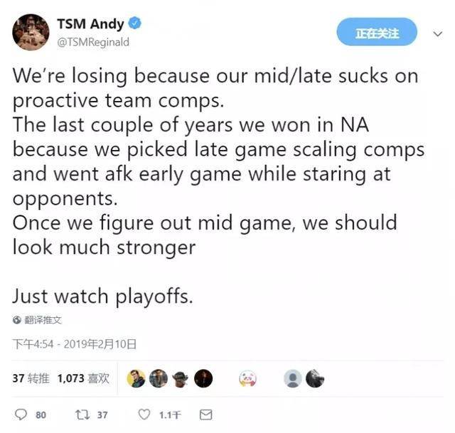 近日TSM的管理者猩猩队长和战队主力中单选手比尔森都在推特上面做出了检讨,表示确实是中后期团队执行力不佳,如果能改掉队伍中的这些小问题,就还能抢救一下,在世界赛上可以回归!TSM自从当年大师兄去TL战队之后就一落不起,比尔森在前面两年还是很能C的存在,但是这两年随着北美不少强势中单的崛起,他也不再有之前的统治力了,所以求胜之路上面非常艰难。