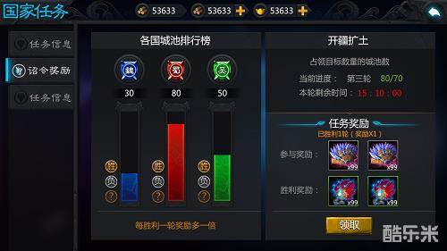 “开疆扩土”开启时将为三个国家各激活一个城池数的攻占目标,规定时间内达到目标取胜;