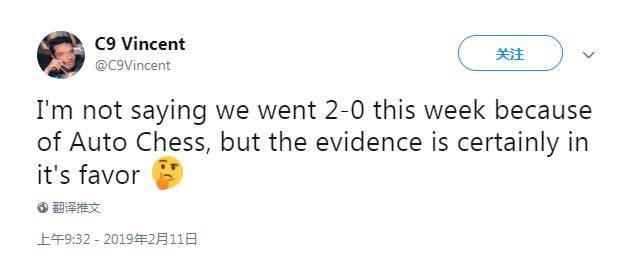 在刚刚结束的2019LCS春季赛第三周比赛中,C9战队击败两个对手取得了全胜成绩。战队经理Vincent发推表示:“我的意思不是说我们这周能2-0是因为自走棋,但肯定是有许多对此论点有利的证据。”