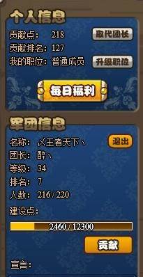 如果别人的贡献度超过了你,那他就能升级职位,而你却被他挤下来,而降级了~所以呢,每天保持一定的贡献度是非常必要的哦!