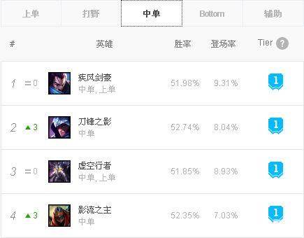 劫的胜率虽然相对上个版本下降了2位但是依旧强势,稳坐T级中单排行,登场率上升4位,劫可以说是联盟最秀的刺客英雄,超高的可玩性让劫成为大家一直钟爱的英雄。