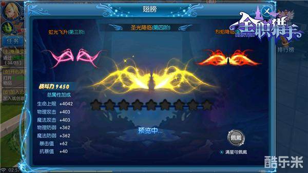《全职猎手》中的翅膀通过主线任务开启之后,即可成长和培养,通过升级到第一次满星就能佩戴了。翅膀系统中的不同等级翅膀,均为光翼形象,以流动的能量为载体,幻化出战力的延伸。翅膀升星和升阶之后,玩家的战力和属性都可获得大量加成哦,所需材料在相应玩法和副本中可以得到。