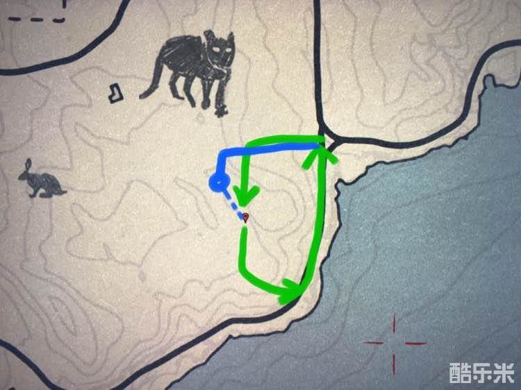 然后来到红标处,从丁字路口进去,山狮可能还不在的,然后按图所示跑到转角处掉头回来,再从丁字路口进去,山狮马上就出现了