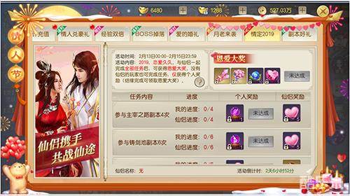 【活动内容】2019,恋爱久久。与仙侣一起完成全部任务后,可获得恩爱大奖。没有仙侣的玩家也可完成任务,仅获得个人奖励(结缘完成可领取恩爱大奖)。