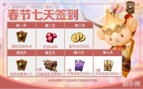 在1月31日至2月13日春节活动期间,各位骑士们只需每日登录游戏即可参与签到领取奖励。每天各不相同的丰厚奖励绝对让你享受绝不重样的幸福,从宠物召唤券、金币、红钻到四皇装备选择券,签到七天更可解锁四星特殊英雄召唤券!今年春节,一定要来《十二战纪》好好充实一下自己的战略储备,为来年的战斗做好充分的准备哟~