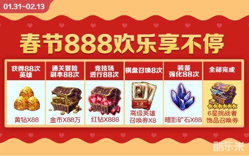 春节这个如此隆重的节日里,一发签到奖励当然是难以填满各位骑士的胃口哒,所以这次的新春嘉年华活动自然要将福利给进行到底。春节888活动的到来就是在为所有的玩家们添了个最传统的彩头,活动期间只要挑战所有与8相关的任务,都可以领取各种好礼。挑战奖励逢8必得,奖励数量自然也是一路8到头,预祝骑士们在新的一年一起发发发!