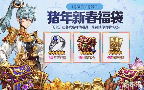 新年将至,相信大家也已经开始了年味满满的假期生活,接下来可就是检验各位新春福运的时候咯。2019新春活动福气“袋”回家活动正式开启,玩家们可以每次使用300红钻来开启一个新年福袋,不同福袋内可是分别包含了5星不灭戒指、4星四皇宝石、四星特殊英雄等各种道具,还不赶紧来试试手气!