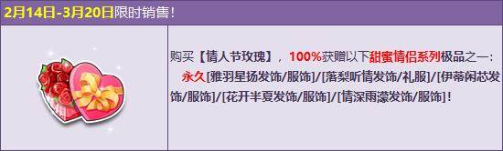 最后编辑于6年前 甜蜜情人节送玫瑰,永久情侣系列极品100%获得!2月14日-3月20日,在飞车商城购买【情人节玫瑰】,有机会获得永久【雅羽星扬发饰/服饰】/【落梨听情发饰/礼服】/【伊蒂闲芯发饰/服饰】/【花开半夏发饰/服饰】/【情深雨濛发饰/服饰】。