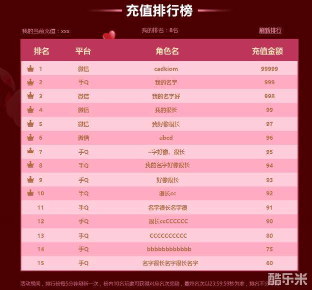 在活动期间,充值金额最高的前100名玩家将会登上情人节充值排行榜。排行榜5分钟刷新一次,榜内前10名的玩家将会获得名次对应奖励,前20名的玩家还将活动精美礼品。