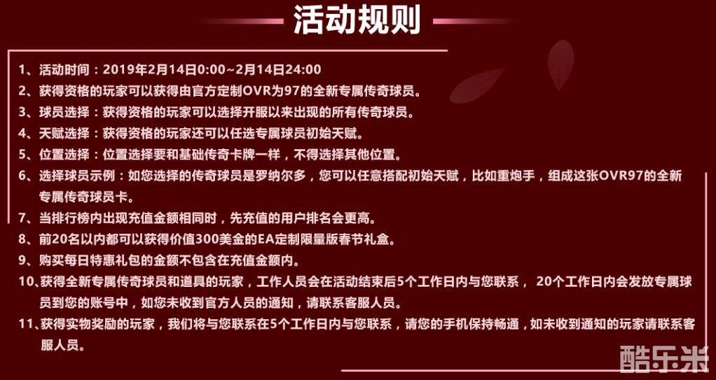 1. 活动结束后,排名前10的玩家将会获得OVR97的专属定制传奇球员以及名次对应的资源奖励。