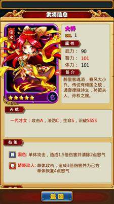 大乔开始就有送,普攻减2点怒,技能是给本方怒气最低的加四点怒气,加上四个s的识破,放二号或者五号可以轻松推一些boss开场满怒的图,比如关羽,非常好用,没有适合的武将还她甚至可以加五来拼技能,假如一号贾诩放了技能,她在六号,肯定是给贾诩加满怒,然后贾诩又可以控对方一回合。