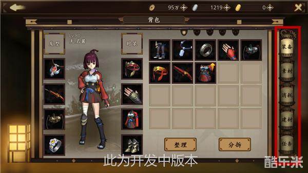 在背包中,我们可以对角色装备、素材、消耗品、建材、任务物品进行查看。