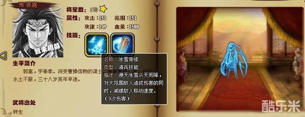 塔防三国志神郭嘉是一名很不错的武将,漫天冰雪从天而降,对大范围敌人造成伤害的同时,减缓敌人移动速度。