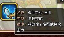 释放后,增强武将攻击力。除了活动黄的专属技能,战斗之心就是最强单挑技能了毋庸置疑。