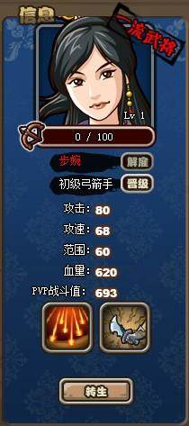 塔防三国志武将步婉是一名一流武将,拥有万剑火雨技能,至残之仍三阶。