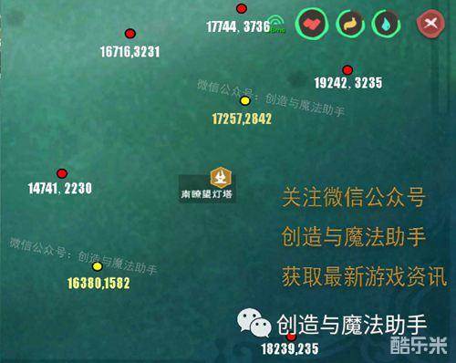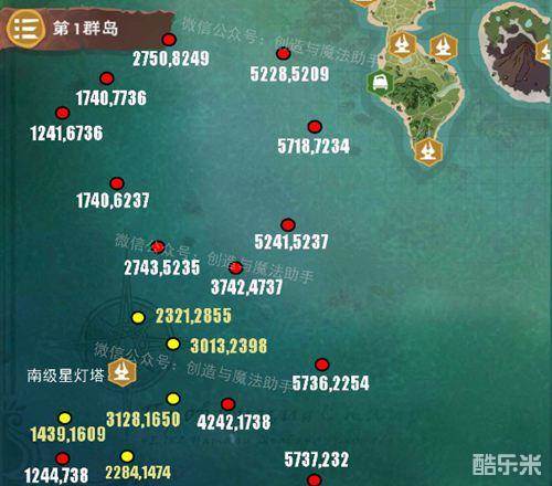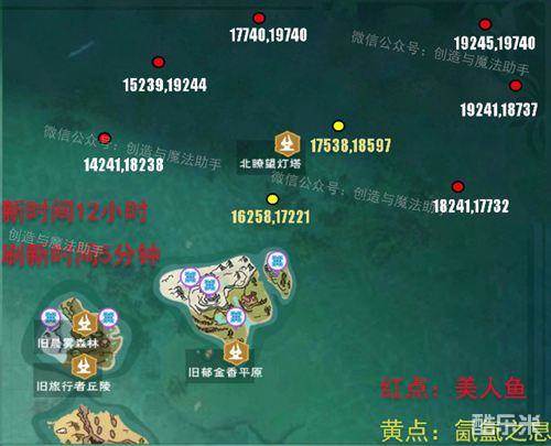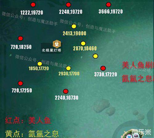 氤氲之息主要分布在海面上,下图中黄色点坐标为氤氲之息坐标,刷新时间5分钟。(红色为美人鱼坐标,刷新时间12小时)