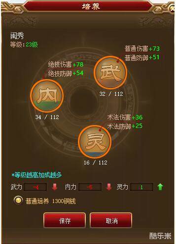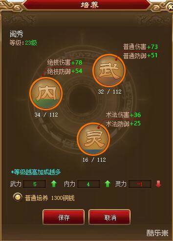 以上图为例,虽然灵力减少了1,但是武力和内力都增加了,而这个增加的属性可以弥补减少属性的战力,所以这个培养结果就可以保存下来。相反,就可以把培养结果取消并重新进行培养。