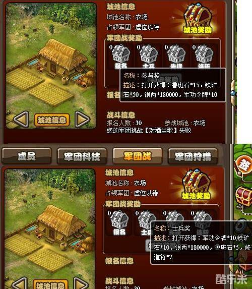 再以襄阳为例:两个团报襄阳,战胜的团,报名可以得到9个牌子,士兵奖励9个牌子,或是先锋奖励26个牌子,连斩不得牌子就不说了,然后是城池每天8个牌子,6天一共48个牌子,这样每星期一共是普通士兵66个牌子,先锋83个牌子。