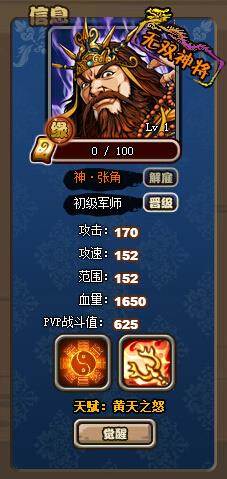 PVP技能:惑乱天下:神•张角引发天下百姓怨气,出场时降低对手和对方随机4名未上场武将攻击速度。