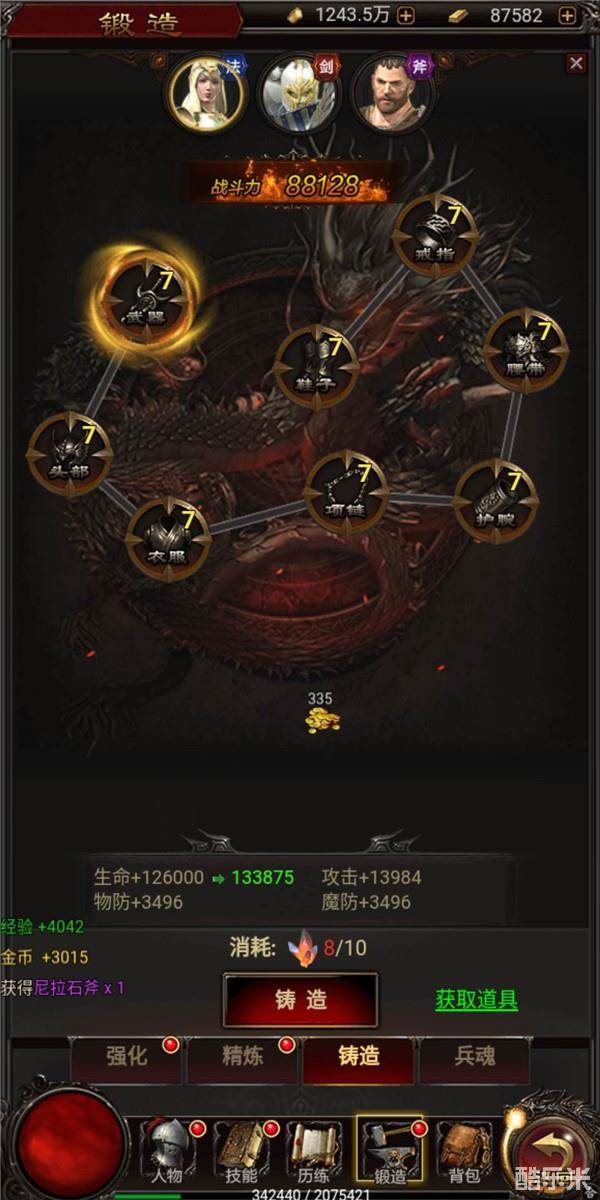 每个角色每个装备部位都可以进行铸造,增加的属性相同,更换不影响铸造等级,可以通过副本、商城、活动获得铸造材料。