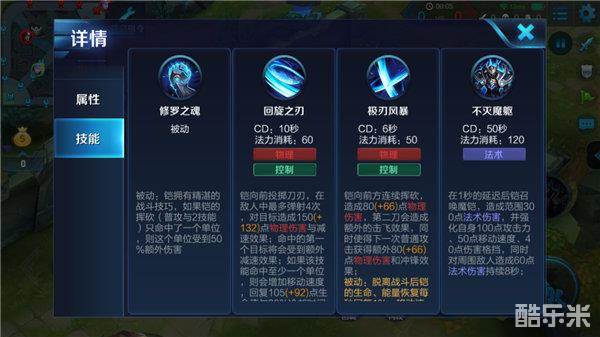 三技能-不灭魔躯:施放技能一秒后召唤魔铠,造成范围法术伤害,并加强自身攻击力、移速、格挡、法术吸血,同时还会对敌人造成持续一段时间的法术伤害;该技能增加铠单挑能力,在一、二技能冷却时间内可以多使用普通攻击进行输出。