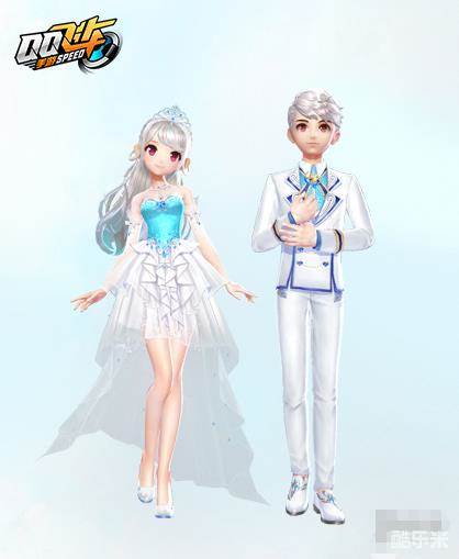 女生的套装采用碧蓝色搭配纯白色的抹胸短裙,层层叠叠的洁白裙摆轻轻摆动,有莹莹光芒跳跃,修饰出女生纤细的身形,搭配碧蓝色宝石王冠,俨然是童话故事中娇美可爱的公主。