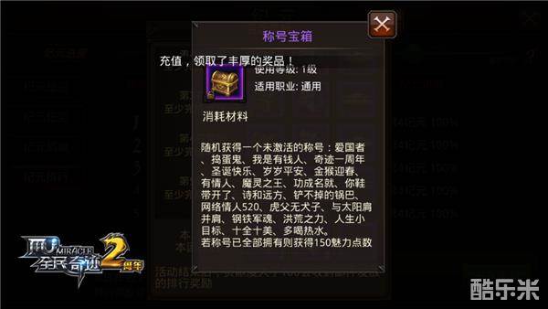 除此之外,前五名完成第4纪元100%进度的军团成员,还将获得数量不等的称号宝箱,以随机获得一个未激活的称号,称号宝箱可能会获得没拥有的称号,也有可能获得已经拥有的称号,当获得已经拥有的称号时会转化成魅力点数。