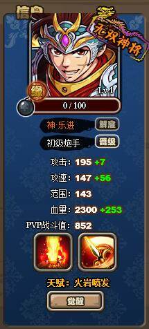 神•乐进拥有全新天赋【火岩喷发】:派驻神•乐进到神武大炮中,对范围敌人造成燃烧眩晕效果