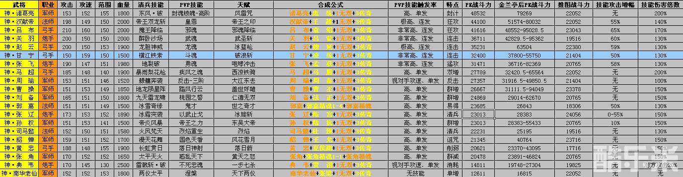 神·甘宁的定为,是平民化路线的高级连发物理武将,他的问世其实是为了解决大多数普通玩家运气不佳手中没有强力物理战心将的问题。因此,30000武魂和攻击增幅50%的定位就已经说明这一良苦用心。那么,到底神·甘宁与吕布、关羽、赵云、张飞四大物理神将相比,到底差在哪里?这里做一个最简单直接的表述。情缘和攻击增幅低并非神·甘宁综合价值低的主要原因,四大物理的情缘本就不是平民玩家能够染指,反倒是甘宁+凌统的情缘大家都能拿到。而技能攻击增幅也不是真正导致神·甘宁价值低的原因,只要攻速和强运战旗有所优势,形成技能压倒性连发,技能伤害低也不是大问题。真正的缺点,在于神·甘宁的技能连发数量是有上限的。一般来讲,一旦攻速压制,关羽、赵云这样的神将,可以直接用连续技能连死对手。神·甘宁作为身心类神将也是拥有连发特点的,但是他的连发并非不间断,在连发的过程中更容易出现间歇。这样一个间歇的出现,就给了对方武将喘息的机会,对方就容易打出技能来,倘若神·甘宁面对的是神·吕布、神·关羽这样对手,给对方喘息的机会可能是致命的。而四大物理神将在9级强运的情况下,一旦攻速有优势,基本上不会给敌人喘息机会的,可以一气呵成的连死对方。虽然神·甘宁的这个技能间歇,在强运战旗较高、攻速优势明显的情况下,不是很经常的出现。但是在硬碰硬的时候,对位四大物理神,还是会让人捏一把汗的。这便是拉低神·甘宁综合价值的最重要因素。也许不看攻速情缘加成,单论武将相对技能触发率,神·甘宁甚至比神·张飞要高,也不在关羽和吕布只下。但是这小小缺陷,也许就真的拉开了他与四大神之间的距离。