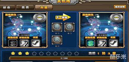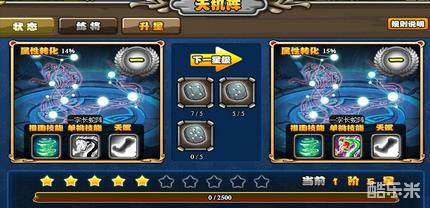 这个是一阶三星解锁所需要的图片。需要勾型,雁型,锥形*5.这里面雁型难度最高。前前后后蛋蛋大约用了一万多魂才凑齐五个(前两天才凑齐)。锥形、勾型两种石头可以套用初级配方。雁型需要套用高级模式才能做出来,产率超低。这次活动出了兑换,想玩天机阵的,大家尽量都兑换雁型吧。 一星三阶解锁推图技能,相当于多了一个诸葛推图,冷却20秒,不消耗能量点,超猛。点击技能右上角绿色按箭头可以升级技能,消耗功勋。第一次20万功勋,第二次40万功勋,后面蛋蛋还没试