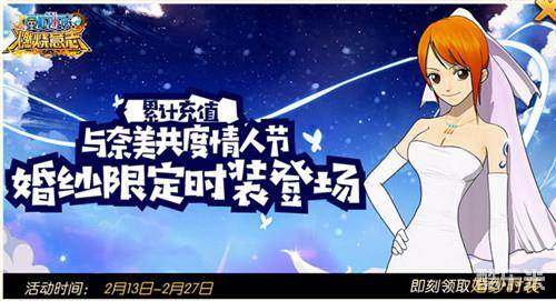 娜美×?其实在很多海米心中,娜美是《海贼王》的第一女主,关于娜美的CP传闻也有很多。路飞和娜美认识时间最长,而且路飞对娜美可以说有再生之恩,而且除了娜美再没有哪个女性角色能揍飞未来的海贼王路飞,二人关系可见一斑。山治似乎对娜美特别偏爱,叫别人都是“桑”的,叫娜美就是“酱”。我们娜美这么人见人爱,小编不允许她跟除了小编本人之外的人在一起! 为了庆祝情人节,《航海王:燃烧意志》在游戏中推出了娜美情人节限定时装,身着洁白婚纱的娜美面带微笑款款向你走来,久等了,欧尼桑!这样如梦如幻的场景,在《航海王:燃烧意志》中参与活动就能看到啦,赶快登录游戏,把你全部的爱交给小贼猫娜美吧!