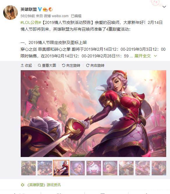 明天就是2月14号情人节,英雄联盟国服官方在今天下午公布了19年的情人节皮肤详情,同往年一样,今年的两款情人节皮肤还是以女性为主,一款是菲奥娜的穿心之剑,一款是碎心之拳 蔚,这两款皮肤在明天中午十二点会正式上线游戏中半价销售。