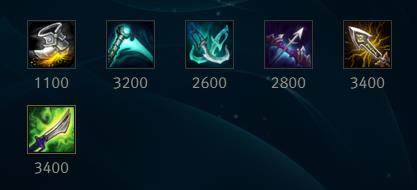 选择一个回调的吸蓝刀,在有W提升攻速的情况下,前期可以提供攻击力和价格来说,收益非常高,第二件选择一个攻速装备偏防御的幻影之舞配合水银弯刀和R技能,使得有装备的霞基本是无限在输出完全不用担心的自己的位置。最后再补出增加暴击伤害的无尽和护甲穿透的轻语。