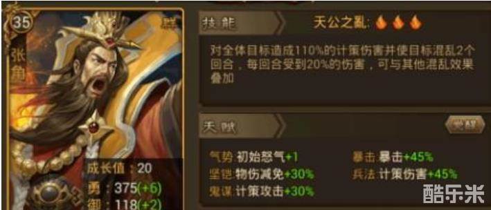 这3人出场可增加30%伤害,非常不错。张梁、张宝都是两怒技能,可瞬间对敌方前排造成很大的威胁。