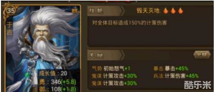 就算第二回合不能清干净,第三回合于吉张角坚持到出技能随便一个出手都能带走全场。唯一的不足就是 比较脆,没有奶 。