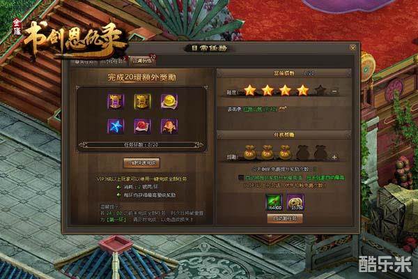 萌乐网新游《书剑恩仇录》中,玩家每天24:00可以领取20环江湖历练任务。江湖历练任务要求玩家击杀江湖当中的各类人物,任务共有5个难度等级,难度等级越高,奖励越丰厚。玩家可以选择让系统自动跑任务,也可以消耗元宝快速完成任务。若玩家在每天24:00之前未完成全部任务,则次日将被重置为第一环,所以一定要及时完成江湖历练任务,以免造成损失哦!