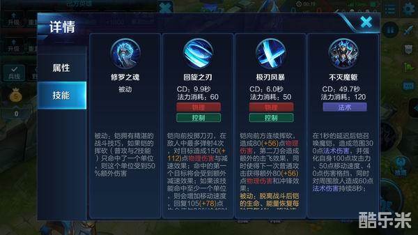 被动技能——修罗之魂:铠拥有精湛的战斗技巧,如果铠的挥砍(普攻与2技能)只命中了一个单位,则这个单位会受到一定的额外伤害。