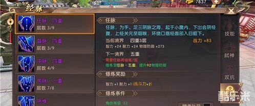 督脉:阳脉之海,主骨生髓。督脉主要是增加智力,精神,每一重都会提升一定的魔法防御。(魔法防御也就是减少魔攻职业对自己造成的伤害)