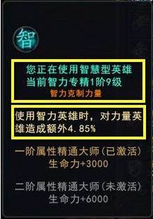 英雄属性专精系统,属性等级共分为5阶,每阶分为1-10级。玩家通过属性专精系统进行力、敏、智三属性提升,可提升召唤师手中对应属性的英雄战力及生命力。在PK战斗中通过选择克制地方属性的英雄,可增加更大伤害百分比增,获得更大战斗胜算。