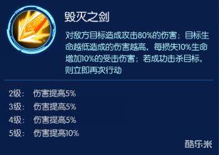 【普攻技能:毁灭一剑】对敌方目标造成攻击80%的伤害;目标生命越低造成的伤害越高,每损失10%生命增加10%的受击伤害,若成功击杀目标,则立即再次行动。普攻技能是战斗暴龙兽的必杀技和被动的整合,具备强力的收割能力,如果敌方全体残血,那么奥米加普攻连击就可以一波带走。