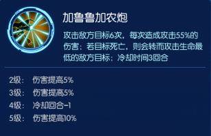 【必杀技:加鲁鲁加农炮】攻击敌方目标6次,每次造成攻击55%的伤害,若目标死亡,则会转而攻击生命最低的敌方目标,冷却时间3回合。必杀技是金属加鲁鲁兽的必杀技的变形,具备更强的输出。