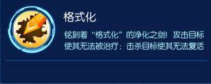 【被动:格式化】铭刻着“格式化”的净化之剑,攻击目标使其无法被治疗,击杀目标使其无法被复活。永久的禁止治疗和击杀无法被复活,在现如今回血流复活流盛行的冠军大赛简直使神技,试想现版本奥米加一个EX敌方全体无法治疗,这样的对局怎么会输?