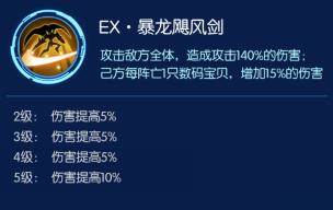 【EX:暴龙飓风剑】攻击敌方全体,造成攻击140%的伤害,己方每阵亡一个数码宝贝,增加15%的伤害。这个技能绝对是绝境翻盘的神技,一旦我方只剩奥米加兽,一个EX群体240%攻击的伤害,爽歪歪。