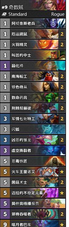 补丁后,许多选手在探索这个老牌强势卡组的新构筑,但无论从哪个角度看,其实整体强度都已远不如前了。冷血的削弱几乎是同时剥夺了奇数贼的快攻能力和斩杀能力,现在只剩下菌菇双架能作为进攻节奏上的爆点,迈拉和火车王的终结能力也大幅下降。这是目前一套胜率比较高的卡组,可以看出还有很大的完善空间。
